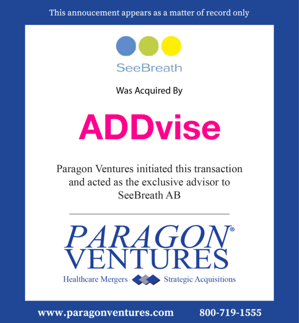 Tony Marsallo, Managing Director for Paragon Ventures who managed the sale process for SeeBreath remarked, “With all of the focus on respiratory products throughout the Covid-19 pandemic, it was an honor to work with the owners of SeeBreath and bring their vital respiratory monitoring capabilities to an expanding worldwide market.”